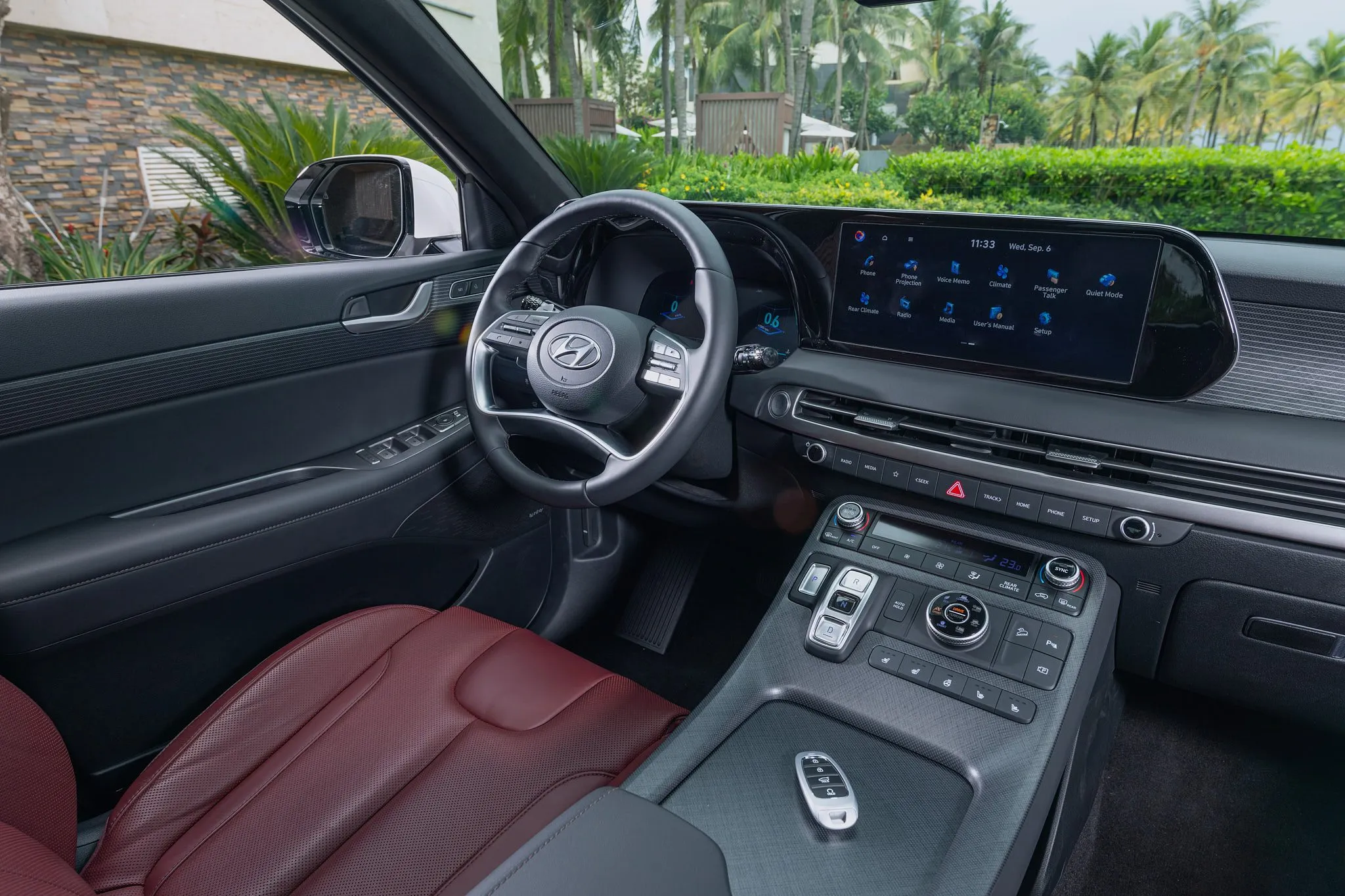 Hyundai Palisade, như nhiều mẫu xe khác của Hyundai gần đây được trang bị chuyển số nút bấm “Shift by wire”, kết hợp lẫy chuyển số sau vô lăng. Palisade được trang bị màn hình hiển thị thông tin kính lái HUD có độ phân giải 480p, có diện tích hiển thị tương đương 10 inches. Các trang bị khác có thể kể đến như chìa khóa thông minh khởi động nút bấm kết hợp khởi động từ xa, phanh tay điện tử, cốp mở điện, rèm chắn nắng cho hàng ghế sau, điều hòa tự động, cửa gió điều hòa và cổng sạc cho 3 hàng ghế, kính chiếu hậu trong xe là loại chống chói điện tử ECM,…