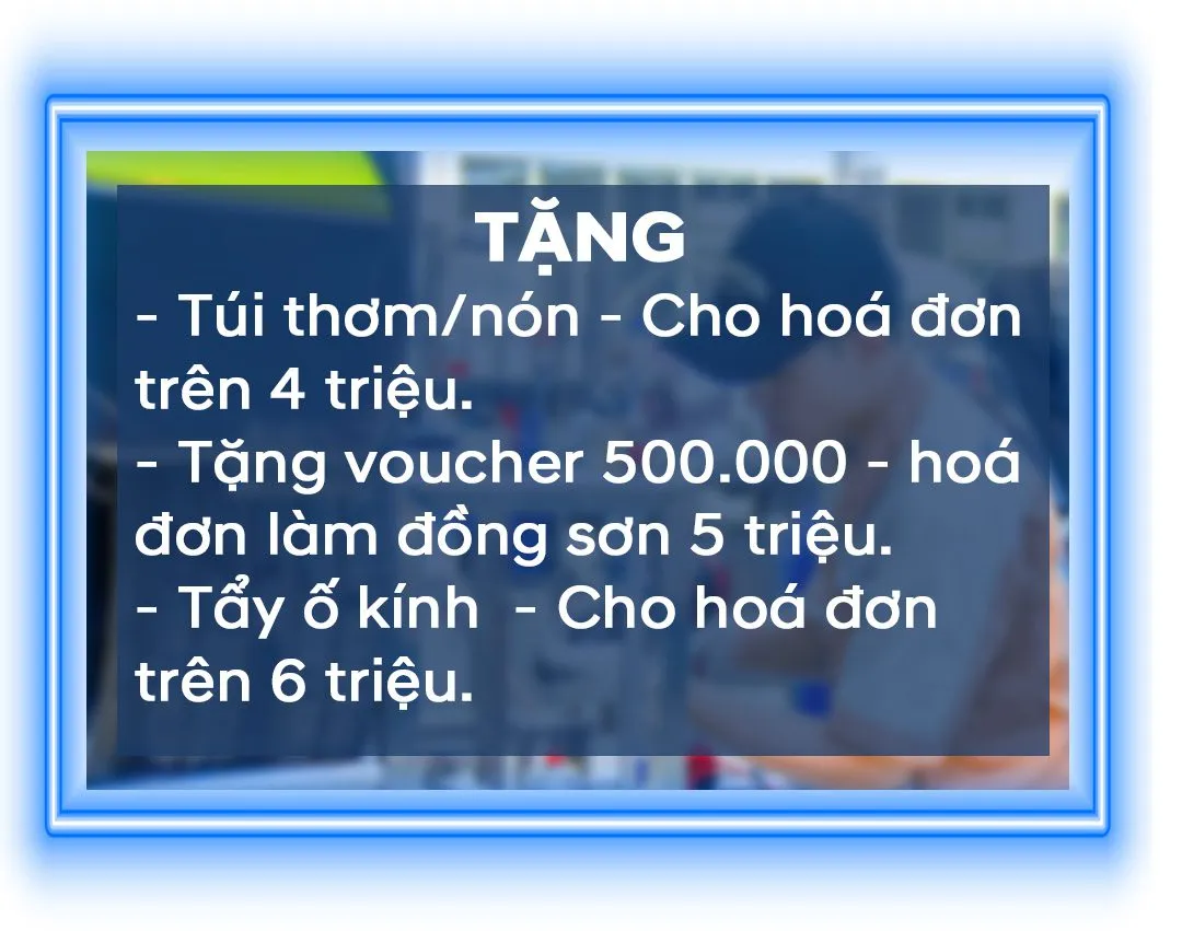 – Tặng Dịch vụ tẩy ố kính cho xe làm bảo dưỡng, sửa chữa, đồng sơn có hóa đơn trên 6 triệu (không bao gồm phụ tùng thay thế).
