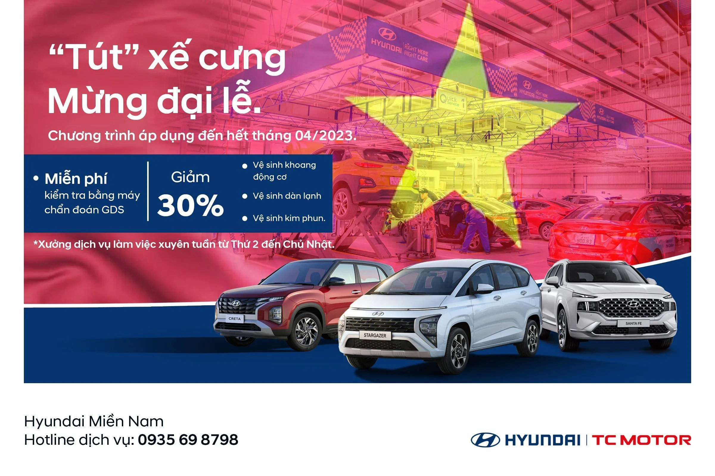 Nhân dịp đại lễ 30/04 Hyundai Miền Nam gửi đến Quý khách hàng chương trình khuyến mãi dịch vụ: